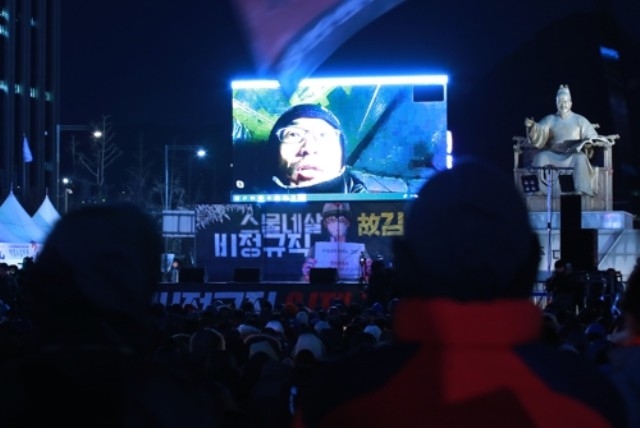 ▲ 서울 목동 열병합발전소 75m 굴뚝에서 고공농성 중인 금속노조 충남지부 파인텍지회 박준호 사무장이 12월 29일 광화문 광장에서 열린 고(故) 김용균 2차 범국민 추모제에서 영상통화로 메시지를 전하고 있다. ⓒ연합뉴스