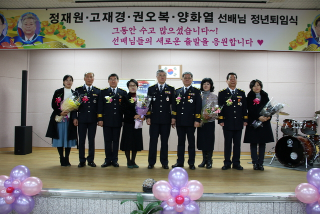 명예로운 정년퇴임 주인공들은 정재원 소성파출소장, 고재경 영원치안센터장, 권오복 정보화장비계장, 양화열 정우치안센터장, 안선형 덕천치안센터장, 김용성 옹동치안센터장 등이다.