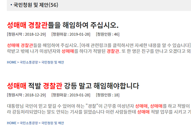 또 다른 청원 게시자는 '성범죄 저지른 경찰은 파면해야된다'는 글을 통해 "일반인이 성매매하면 처벌받고 경찰이 성매매하면 무죄인가. 아청법이 경찰에게는 적용이 안 되는 건가"라고 분노했다. 이어 "다른 경찰 사례로 처벌을 강등 수준으로 마무리했다는 게 더 화난다""성매매 및 성 상품화 문제 해결을 위해 두 경찰관 모두 다시 처벌을 내려야 한다"는 주장이 이어졌다.