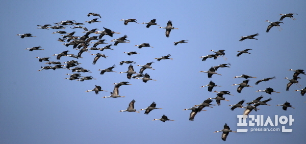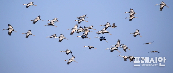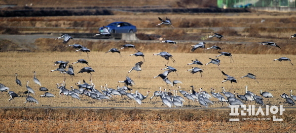 지난 주말 한파를 피해 철원지역에서 월동하던 재두루미 100여 마리가 남하여하 300여 마리의 재두루미가 장관을 연출하고 있다.