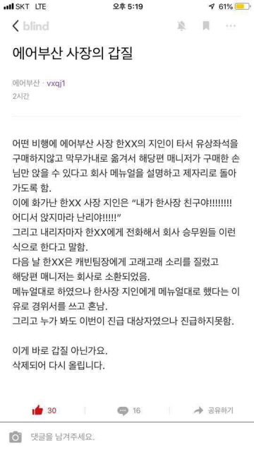 에어부산 한태근 사장이 지인 일행의 항공기 좌석을 바꿔주지 않았다는 이유로 해당 승무원에게 경위서를 받고 승진에서 누락시켰다는 주장이 제기돼 논란이 일고 있다.