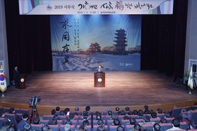 전북 익산시는 2일 솜리문화예술회관에서 2019년 한 해를 시작하는 시무식을 갖고 기해년 황금돼지해의 힘찬 출발을 알렸다.