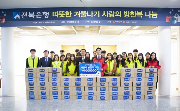 한편, 전북은행은 지역유일의 향토은행으로서 소외계층 이웃들이 따뜻한 겨울을 보낼 수 있도록 김장, 연탄, 겨울이불 나눔 행사 등 다양한 지역공헌사업을 지속적으로 펼치며 나눔과 사랑실천에 앞장서고 있다.