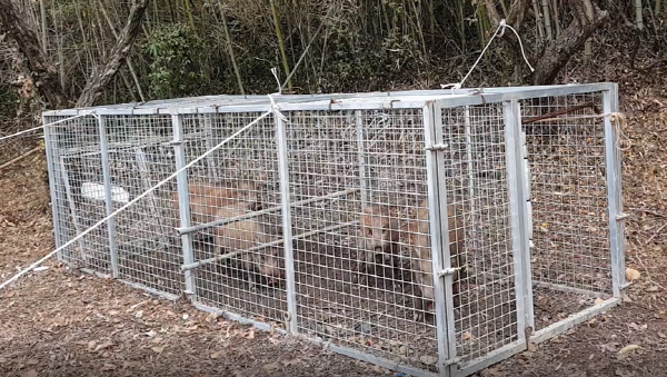 멧돼지 포획 트랩은 위‧아래, 왼쪽‧오른쪽 두 곳에 유입구를 여닫이로 설치한 것으로 멧돼지 무리를 동시에 잡을 수 있는 장치다.