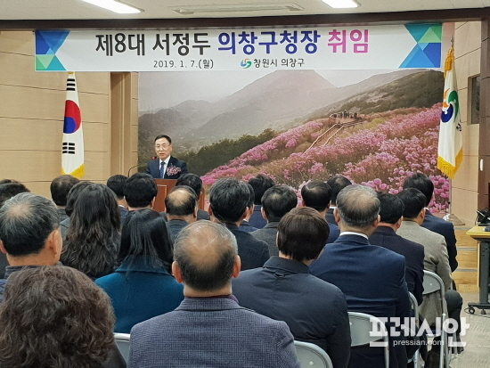 서정두 의창구청장은 이날 취임사를 통해 지역경제 활성화와 서민생활 안정, 소통과 섬김의 행정, 청렴과 헌신의 공직자세 확립을 강조하며 “번영하는 의창구를 만들기 위해 모두의 열정을 한 데 모아 줄 것”을 당부했다.