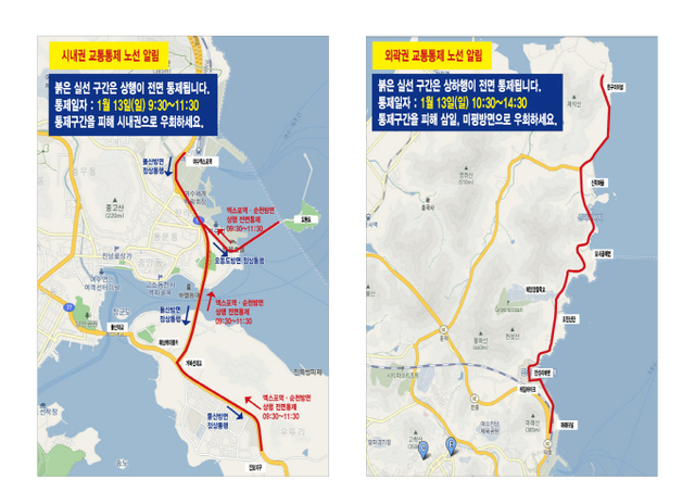 대회일 오전 9시 30분부터 11시 30분까지 ▲오동도 입구→수정사거리→엑스포역 교차로(엑스포 정문 로터리)→여수엑스포역 ▲공화동 사거리(휴게소)→엑스포역 교차로→여수엑스포 ▲돌산진모지구→돌산교차로→거북선대교 상행(순천 방면)→여수엑스포역 구간 노선이 전면 통제된다.