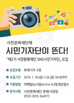 강의태 사천문화재단 대표이사는 “SNS 시민기자단 운영을 통해 시민들의 참여와 공감, 활발한 소통의 장을 마련하고 SNS 홍보 다양화를 통해 시민·관광객들에게 생생한 정보를 전달하는데 큰 도움이 될 것으로 기대하고, 관심 있는 분들의 많은 참여를 당부한다”고 전했다.