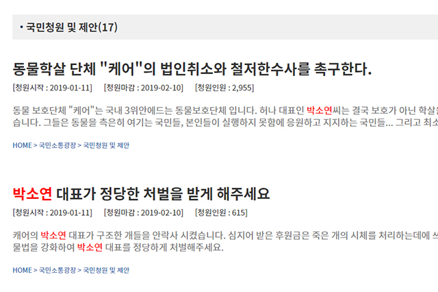 이같은 해명에도 케어와 박 대표에 대한 비난이 끊이지 않고 있다. 청와대 국민청원 게시판에도 박 대표 처벌 등을 요구하는 청원이 잇따르고 있다.