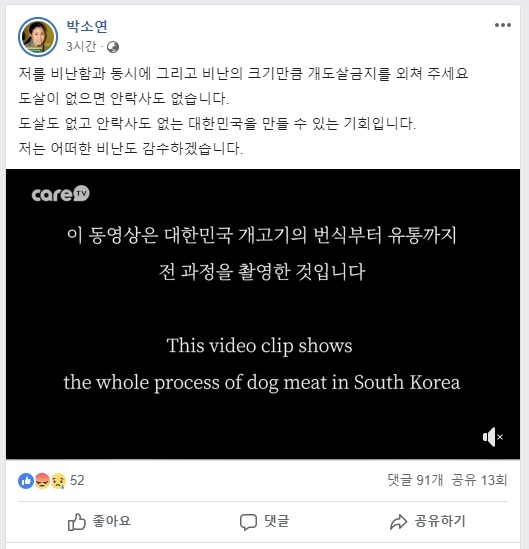 이날 박 대표는 "저를 비난함과 동시에 비난의 크기만큼 개 도살 금지를 외쳐주세요. 도살이 없으면 안락사도 없습니다. 도살도 없고 안락사도 없는 대한민국을 만들 수 있는 기회입니다. 저는 어떠한 비난도 감수하겠습니다"라는 메시지와 함께 개 도살 장면이 담긴 동영상을 올렸다.