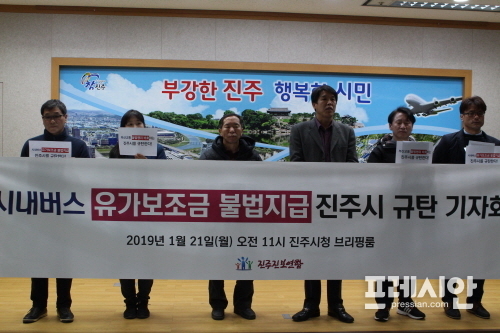 진주진보연합은 21일 진주시청 브리핑룸에서 기자회견을 열고 "시내버스 유가보조금 불법지급하는 진주시를 규탄" 했다.