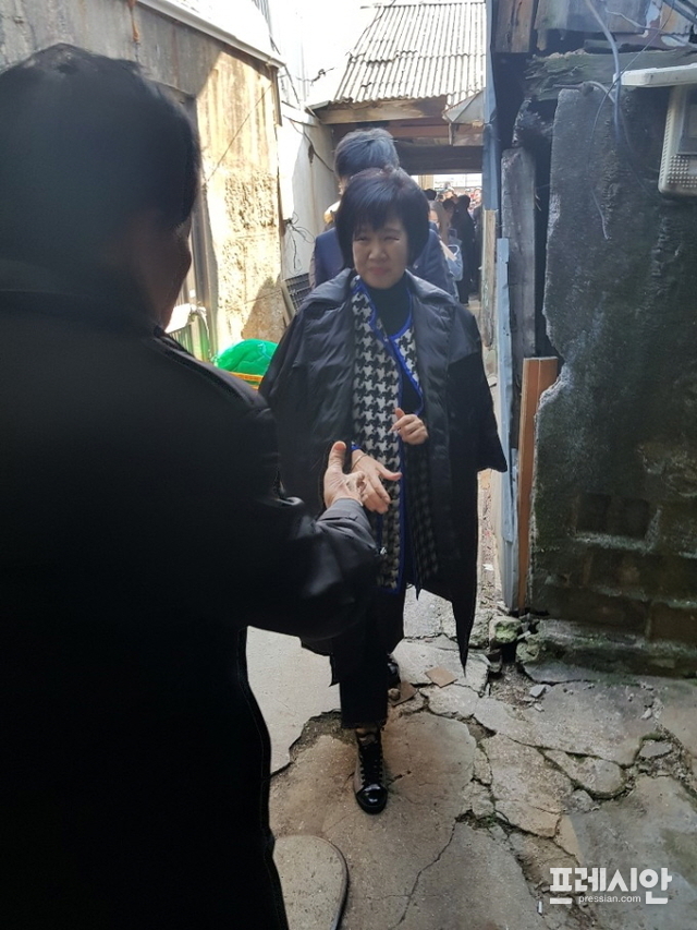 이날 오후 1시 55분께 지역 주민들의 환호 속에 개선장군처럼 등장한 손 의원은 블랙·화이트로 차려입은 패션은 간담회장의 차가운 시멘트벽과는 대조적이었다.