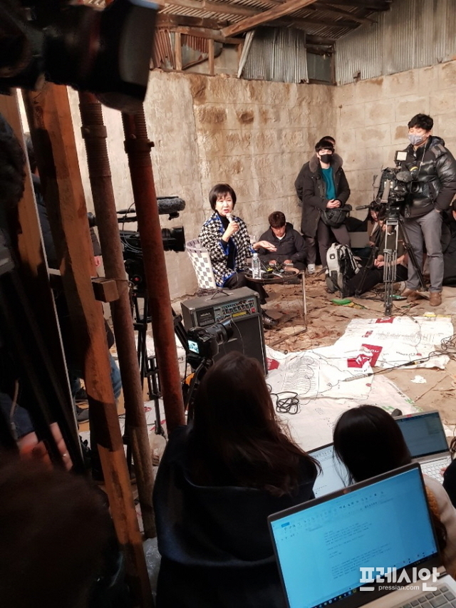 손혜원 의원이 23일 자청한 기자간담회는 전남 목포시 대의동 나전칠기박물관 건립 예정부지로 남편이 이사장인 크로스포인트문화재단 명의로 사들였다는 폐 공장에서 진행됐다.