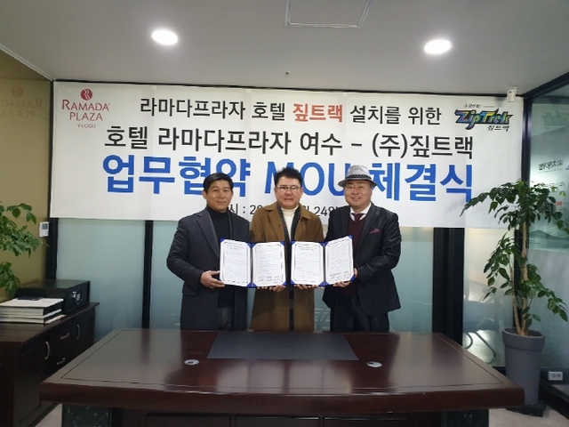 24일 ㈜짚 트랙 대표와 호텔 측은 ‘호텔 라마다프라자여수’ 준공과 동시에 짚 트랙을 운영을 할 수 있도록 추진 중이며, 도착지 지반조사와 측량, 사업타당성 검토 완료 후 양해각서(MOU)를 체결했다. 이는 호텔 개관과 동시에 짚 트랙이 운영될시 영업 시너지 효과가 나타날 것으로 전망된다.