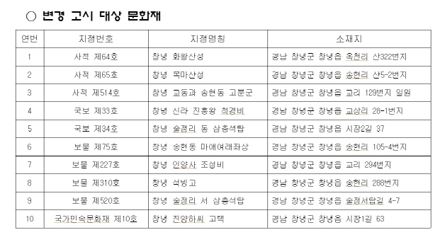 창녕군에 따르면 국보 제33호 ‘창녕 신라 진흥왕 척경비’를 비롯한 창녕읍 내 국가지정문화재 10개소 주변의 건축행위 등에 관한 허용기준을 1일 자로 조정 고시한다.