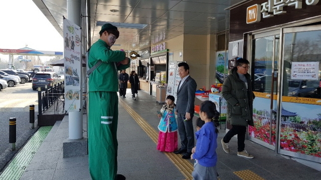 설 명절 휴게소를 찾은 가족과 어린이 귀성객들은 키다리아저씨와의 사진촬영, 캐릭터 풍선 만들어주기 등 예상치 못한 이벤트에 즐거워하며 곡성토란에 대해서도 자연스럽게 알 수 있는 계기가 됐다.