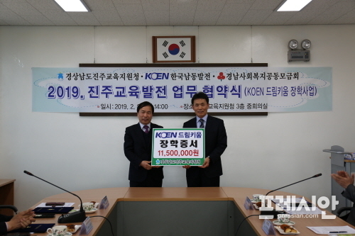 이날 협약식을 통해 한국남동발전은 진주지역 23개 중학교를 대상으로 진주교육지원청에서 추천받은 총 23명의 학생들에게 한명당 50만원씩 모두 1150만 원의 장학금을 수여한다.