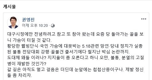 권영진 대구시장은 지난 11일 자신의 페이스북에 ”황당한 웰빙단식, 5·18관련 망언, 당내 정치실종, 철 지난 박심 논란"이라며 최근 한국당 소속 일부 의원들의 막말과 빗나간 정치 행태를 꼬집었다.