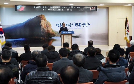 ▲오도창 영양군수가 지난 11일 2019 자율방재단 시무식에서 인사말을 하고 있다. ⓒ경북 영양군