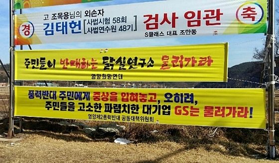 ▲영양 제2풍력 반대대책위가 게재한 GS 영양풍력발전의 고소에 반발하는 내용이 담긴 현수막 ⓒ영양 제2풍력 반대공동대책위원회