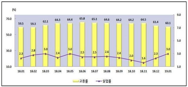 15일 도에 따르면 통계청이 지난 13일 발표한 ‘2019년 1월 고용동향 자료’ 결과 도내 15~64세(OECD기준) 고용률은 67.4%로 전년동월 대비 0.2%p상승, 15세이상(ILO기준) 고용률은 60.1%로 전년동월 대비 0.6%p 상승한 것으로 나타났다.