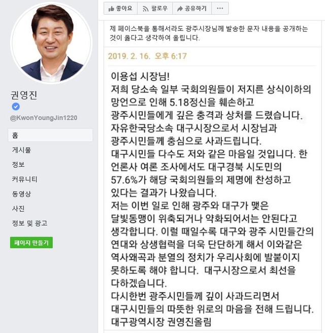 권 시장은 17일 자신의 페이스북을 통해 광주 5·18 민주화운동 유족들을 폄훼하는 당 소속 의원들의 망언을 공개 사죄하는 내용의 문자메시지를 민주당 소속인 이용섭 광주시장에게 보냈다고 공개했다.