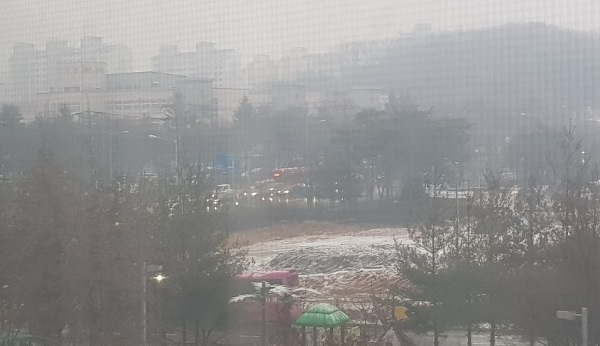 ▲19일 오전, 눈이 비로 바뀌어 내리는 충북 청주시 모습 ⓒ프레시안(김종혁 기자)