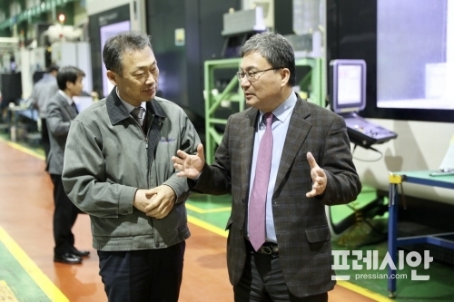 이상직 중소기업진흥공단 이사장이 19일 경남 창원의 ㈜연암테크를 방문해 항공우주 초정밀 가공부품 생산라인을 둘러보고 현장의 목소리를 청취했다.