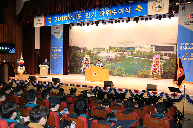 원광대학교 2018학년도 전기 학위수여식이 허종규 원광학원 이사장과 박맹수 총장을 비롯해 교직원, 학생, 가족 등 3,000여 명이 참석한 가운데 20일 오전 10시 30분 교내 학생회관 대강당에서 개최됐다.