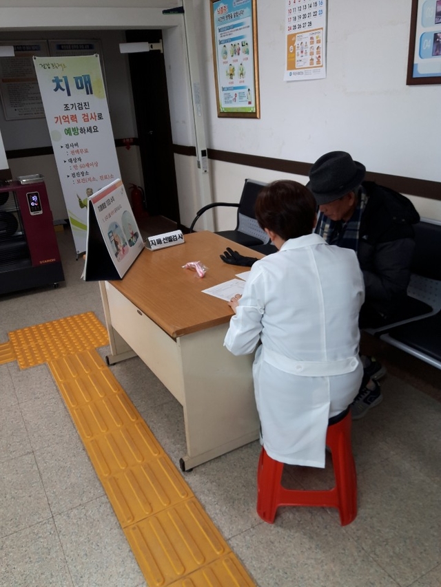 검사는 60세 이상 어르신 대상으로 치매예방과 조기발견을 위해 내소자 및 찾아가는 서비스로 경로당을 방문하여 혈압, 혈당 측정 및 치매선별검사를 실시한다.