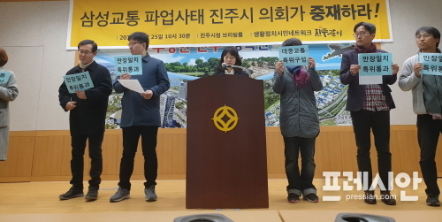 시민 모임 '생활정치시민네트워크 진주같이'는 25일 경남 진주시청 브리핑룸에서 삼성교통 시내버스 파업사태 관련 기자회견을 열고 진주시의회에 중재를 요구했다.