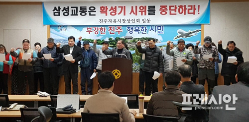 진주시청 인근 자유시장 상인회는 25일 진주시청 브리핑룸에서 기자회견을 열고 "삼성교통의 한달 넘게 한 확성기 시위 중단"을 촉구했다.