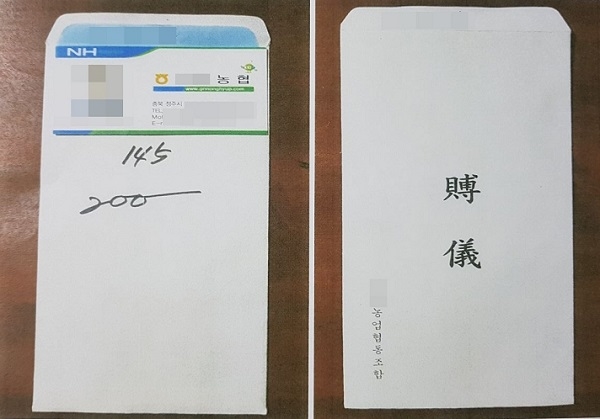 ▲청주 A농협의 B조합장이 조합원에게 경조사비를 제공하면서 본인의 명함을 첨부한 봉투 ⓒ제보자