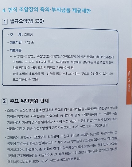 한편 위탁선거법 제36조에는 조합장이 재임 중 조합의 경비로 관혼상제 의식이나 그 밖의 경조사비를 제공하는 경우 조합의 경비임을 명기해 해당 조합 명의로 제공해야 한다고 명시돼 있다.