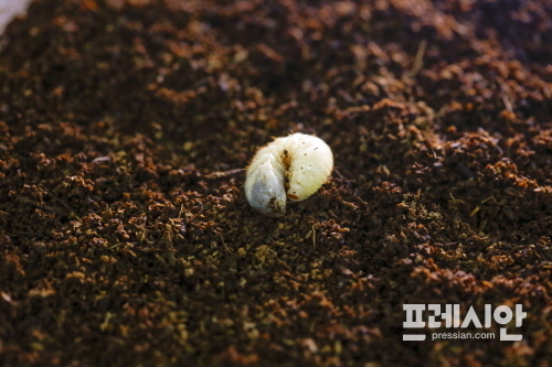 경남농업기술원이 식용곤충인 흰점박이꽃무지 유충의 생산비를 절감하기 위해 새송이버섯 수확 후 배지를 활용한 저비용 먹이원을 개발했다.
