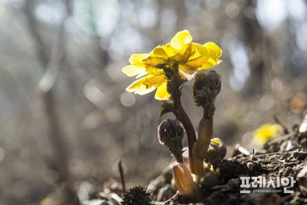 이 노란 꽃은 복과 장수를 상징하는 ‘복수초(福壽草)’로 미나리아재비과 다년생으로 제일 먼저 산야에 피는 새봄 전령사다.