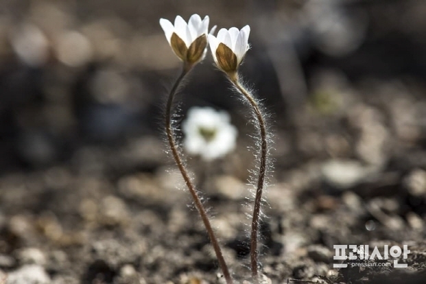 이 복수초와 함께 핀 변산 바람꽃과 솜털 노루귀 등이 봄을 알리는 전령사이다.
