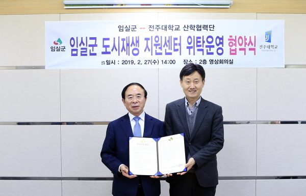 심민 임실군수와 전주대학교 산학협력단 엄수원 교수는 27일 임실군청에서 임실군 도시재생사업의 주도적으로 이끌어 갈 도시재생지원센터 설립 및 운영을 위한 업무 위·수탁을 체결했다.