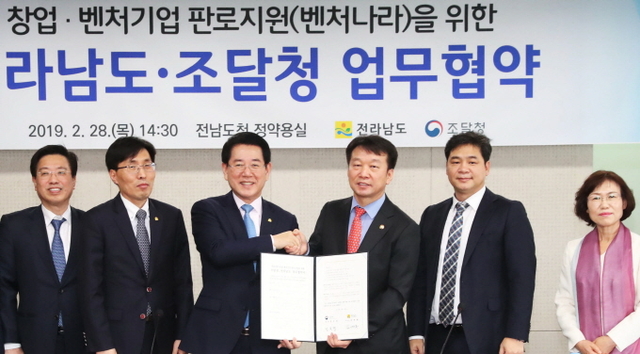 전라남도와 조달청(청장 정무경)이 28일 전남중소기업진흥원에서 ‘벤처나라’를 통한 창업·벤처기업의 공공 조달 시장 판로 지원 업무협약을 했다.