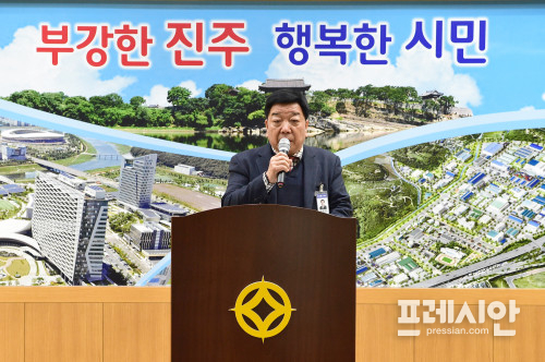 ▲28일 이정희 경제통상국장이 시청 브리핑룸에서 기자 간담회를 열고 KAI 차세대 중형위성조립공장 사천입지 유감 표명하고 있다.ⓒ진주시