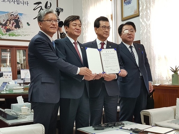 ▲지난해 12월10일 (왼쪽부터)장선배 충북도의장, 김병우 충북교육감, 이시종 충북지사, 한범덕 청주시장이 고교무상급식에 대해 합의했다. 당시 도는 도교육청의 무상급식 분담률 방식을 받아들이면서 자사고를 비롯한 명문고 육성을 합의서에 포함시키며 양 기관의 교육철학이 극명하게 드러나기 시작했다 ⓒ프레시안(김종혁 기자)
