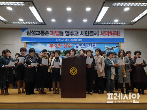 경남 진주시 여성단체협의회 회원 30여 명은 7일 오후 시청 브리핑룸에서 기자회견을 열고 삼성교통의 파업철회와 시내버스 정상 운행을 촉구했다.