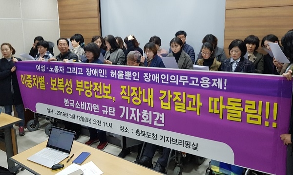 충북여성연대를 비롯한 지역 시민사회단체는 12일 충북도청에서 기자회견을 열고 “한국소비자원은 여성장애인노동자에 대한 부당전보 및 자별을 시정하라”며 “허울뿐인 장애의무고용제 지도 감독 및 처벌을 강화하라”고 밝혔다.