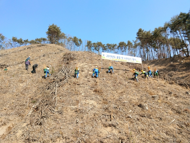 ▲북부지방산림청은 14일 강원도 횡성에서 북부지방산림청장과 관계 공무원 및 국유림 영림단이 참여한 가운데 '새산새숲 봄철 첫 나무 심기'를 했다. ⓒ북부지방산림청