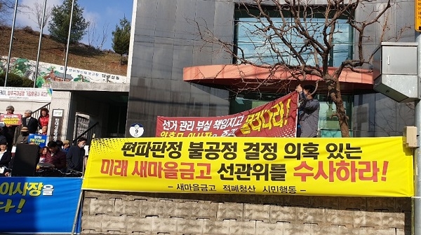 ▲충북 청주시 미래새마을금고 일부 회원과 시민 등 100여명이 15일 금고 총회장 앞에서 무효판정이 난 이사장선거에 대해 항의하는 집회를 벌이고 있다 ⓒ프레시안(김종혁 기자)