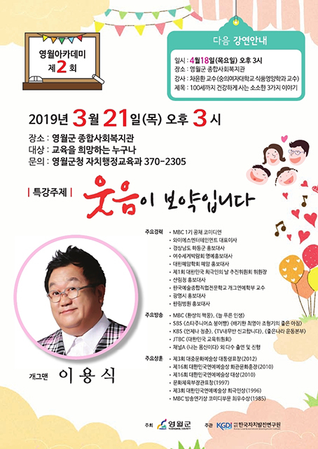 영월군은 오는 21일 오후 3시 영월군 종합사회복지관에서 개그맨 겸 방송인 이용식 씨를 초청해 ‘웃음이 보약입니다’ 를 주제로 영월아카데미를 개최한다.