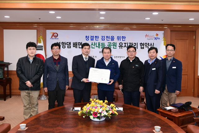 김천시가 18일 한국수자원공사 김천 부항지사와 부항댐 배면, 산내들 공원의 우수한 경관을 조성하고, 유지관리를 위한 협약을 체결했다.