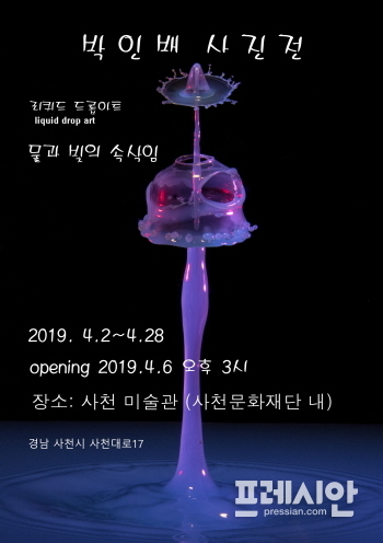 4월 2일부터 28일까지 사천 미술관 에서 리퀴드 드롭 아트 작품 45점과 사천 8경 사진전을 개최한다. 이번 전시회는 ‘물과 빛의 속삭임이’라는 주제로 물방울 예술사진을 선보인다.