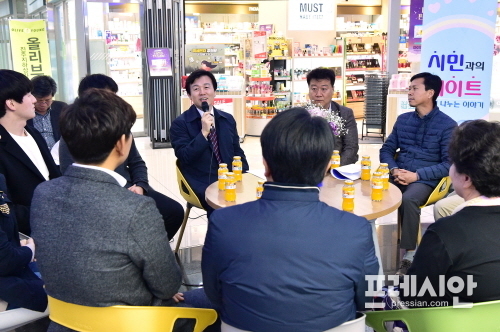 조규일 경남 진주시장은 22일 중앙지하도상가 중앙광장에서 도시재생대학 시민 및 도시재생대학생 서포터즈 등 10여명과 도시재생 및 도심 활성화 아이디어를 나누는 ‘시민과의 데이트’시간을 가졌다.