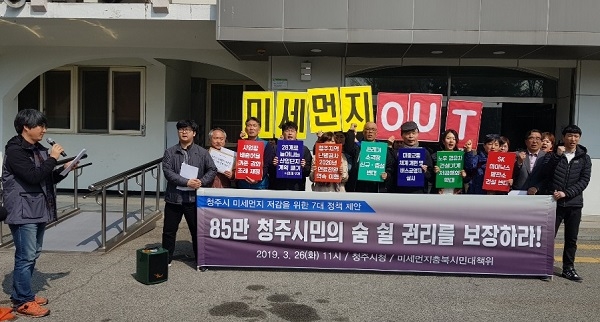 미세먼지 해결을 위한 충북시민대책위원회는 26일 청주시청 광장에서 기자회견을 열고 “개발논리에 앞서 사람들이 기본적으로 숨 쉴 수 있는 대책이 필요하다”며 “당장 시행할 수 있는 것부터 실천하는 대책을 촉구 한다”고 밝혔다.