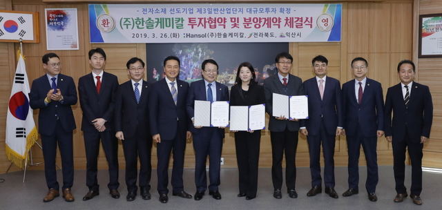 전라북도와 익산시는 26일 익산시청에서 ㈜한솔케미칼 조연주 사장, 정헌율 익산시장, 조규대 익산시의회 의장, 나석훈 전라북도 일자리경제국장, 도의원 4명(김대오, 김정수, 김기영, 최영규)등이 참석한 가운데 익산 제3일반산업단지 투자를 위한 투자협약 및 분양계약을 체결했다.